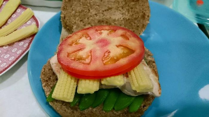 川烫的青菜挪一部分来汉堡这边运用,将五穀汉堡麵包烤过后,铺上甜豆、玉米笋、牛番茄片,热呼呼的煎鸡肉片也摆上来,洒上少许黑胡椒粒增加香气大抵已经完成了。对于製作运动餐食,我们都坚持少油少盐为基本原则,不过......是否觉得这样的健康汉堡少了湿润的酱汁?
