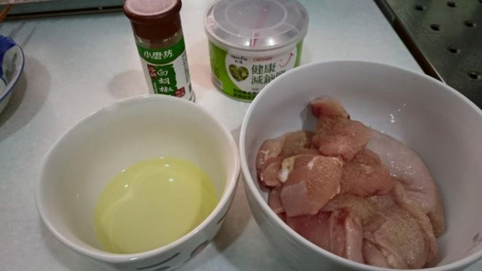 準备一颗蛋白加入少许盐巴和白胡椒粉,倒入有深度的碗公均匀搅拌,两份鸡胸肉放入后用手轻轻按摩,确定肉的每个角落都有沾到蛋白液,静置15分钟再来处理。这个时间空档先川烫青菜,举绿花椰菜、甜豆及玉米笋为例,烫完后的蔬菜可先放入冰箱冷藏。
