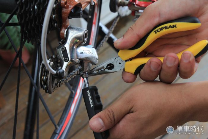 长时间使用变速,变速线张力鬆弛,如果微调螺丝已经转到最开,无法再调整的状况下,则需重新拉紧变速线。先将微调螺丝顺时针转到底,再利用Topeak尖嘴钳,搭配5mm六角扳手,同步将变速线拉紧后锁固。
