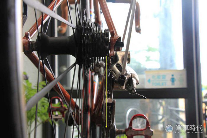 步骤二:从单车正后方观察后变速器,后变速器上2个导轮中心线必须对准最小片飞轮的外侧。若发现非如下图图示的位置,则需要调整H高位螺丝。顺时针旋转H螺丝,导轮则往内移动;逆时针转开H螺丝,导轮则往外移动。