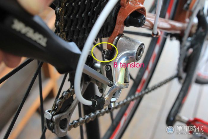 B tension 螺丝的功能,主要是再调整导轮与飞轮之间的水平距离。「大部份是更换飞轮的时候,如原先使用28T,要更改成32T的时候,就需要调整B螺丝。」通常一般情况不需要做调整。