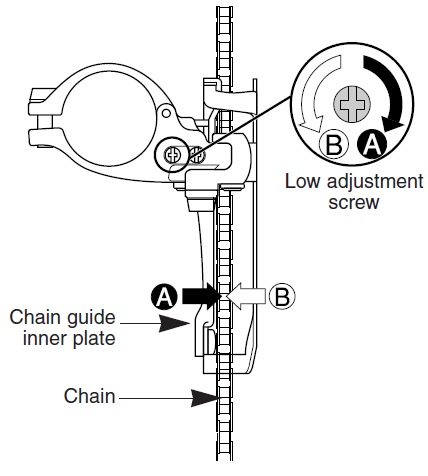步骤二: 从单车正上方观察前变速器,前变速器内侧拨链板是否与链条距离0~0.5mm。若发现链条与内侧拨链板距离小于或大于这个区间,则需要调整L低位螺丝。顺时针旋转L螺丝,拨链板则往外移动;逆时针转开L螺丝,拨链板则往内移动。