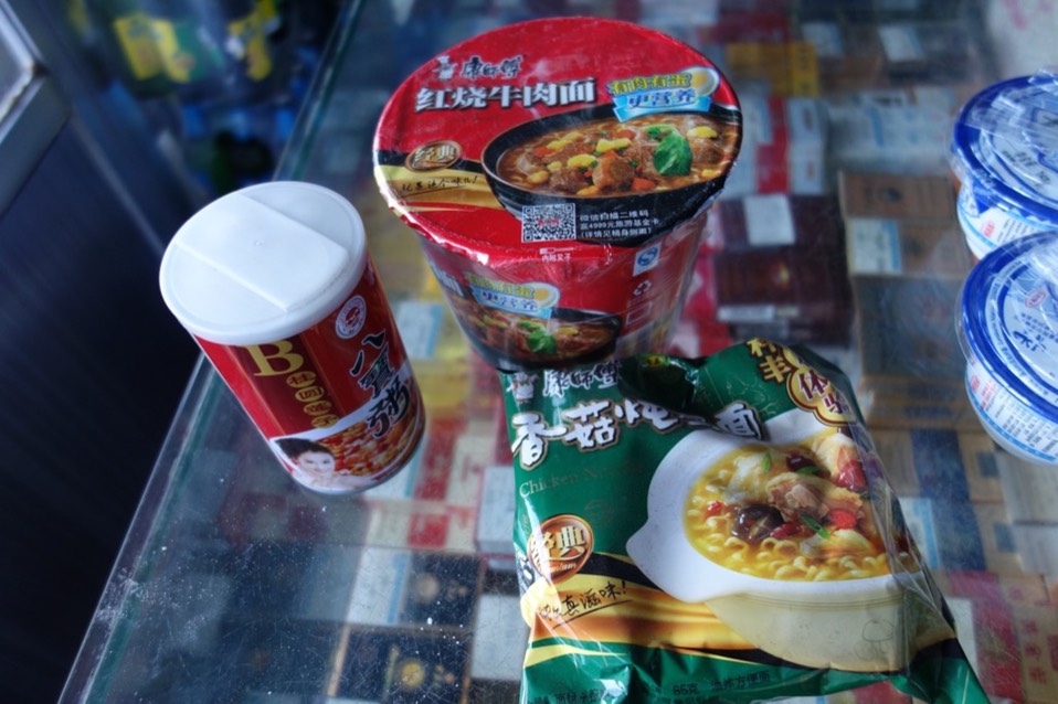 因为旅馆的费用已经占去了大半的生活费,加上早上吃的包子,中午吃的水饺,今天已经超过50元开销,所以晚餐就在商店解决。