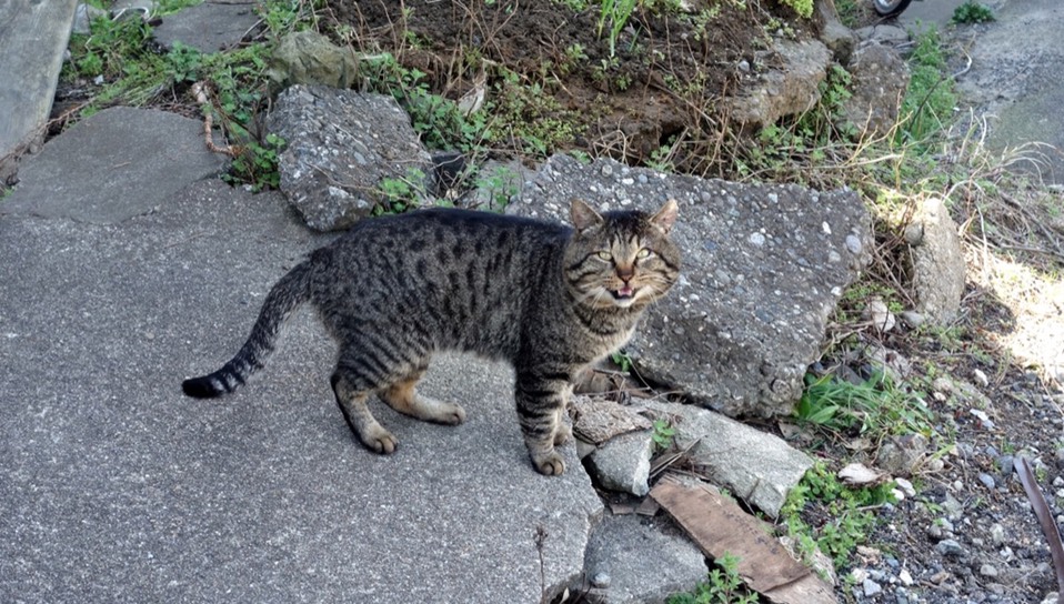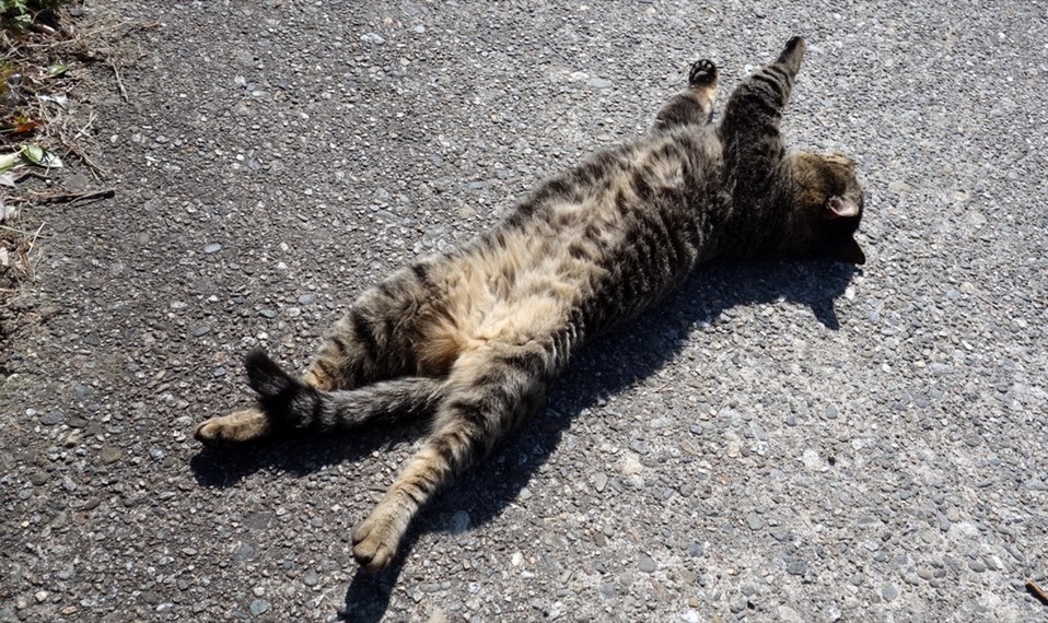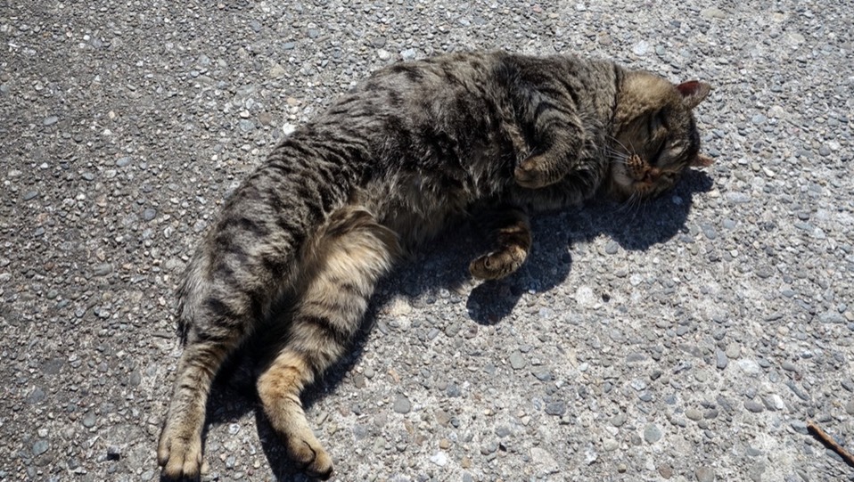 对着我很响亮的喵喵叫,但是我没有食物可以给你吃。很不怕人的一直往前走,走到有太阳的地方就躺下来在地上翻来滚去。