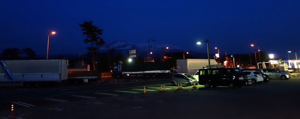 外头已经黑了,看了整天的雪山现在就在眼前,它叫「鸟海山」,那上一个鸟海休息站的森林区肯定就是跟这山有关连了。