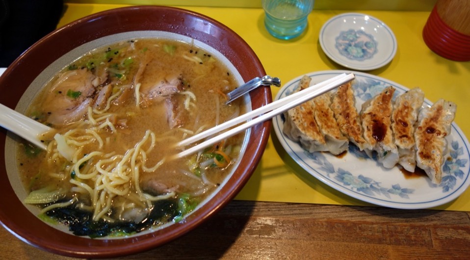 就决定是你了,味噌叉烧拉麵,大碗要加120円。然后再点一份饺子,六颗390円。