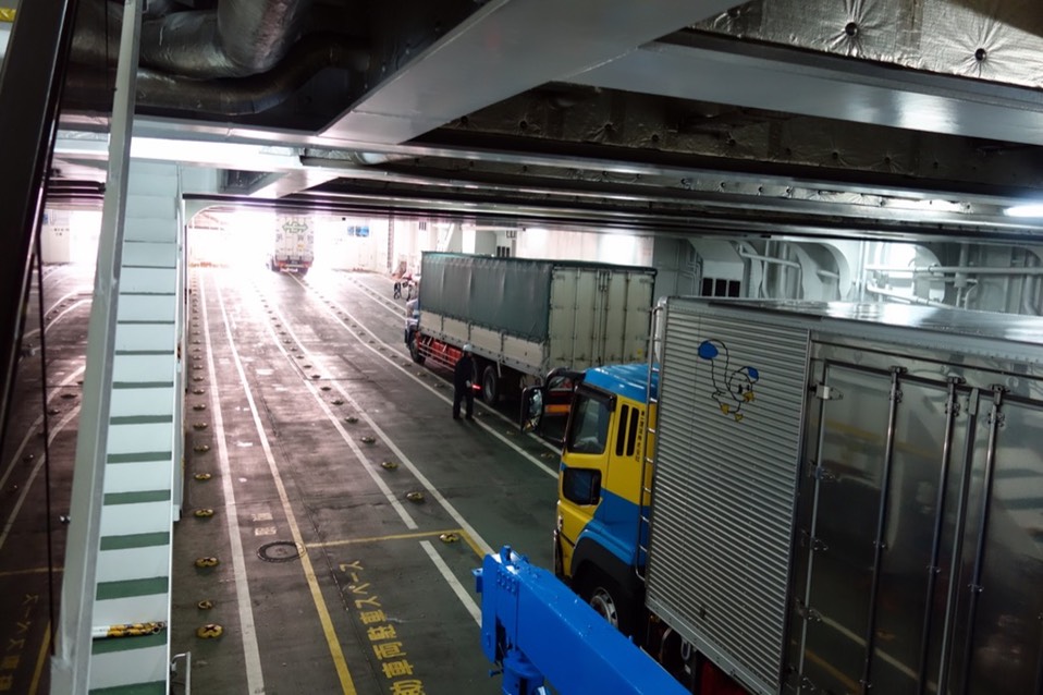 下船跟上船相反,这次是卡车先行,船内广播请司机们到车上作準备,此时消失的司机又鱼贯从专用休息室现身。