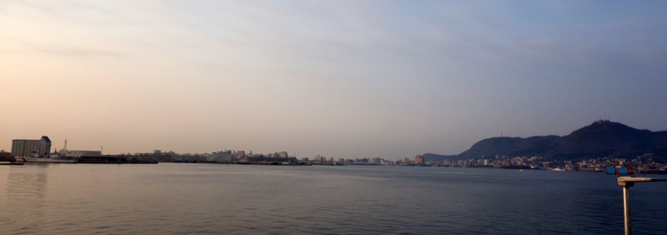 早安~太阳先生,今天也请你多照顾了,这山貌似就是看夜景的地方,山下有很多的码头机具,函馆到了,北海道到了。