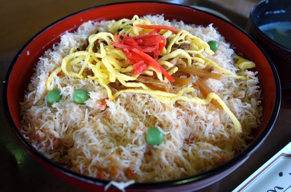 原来是这样呀,把螃蟹弄成碎碎的细丝(调味过的)铺在饭上,加上酱菜、煎蛋丝等,超级无敌霹雳好吃!!!