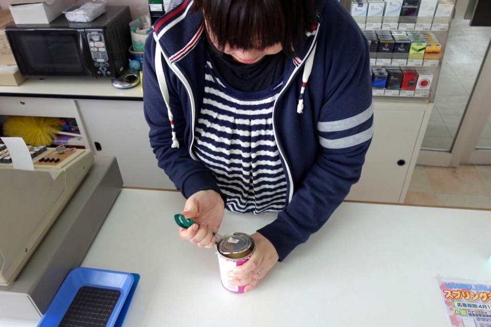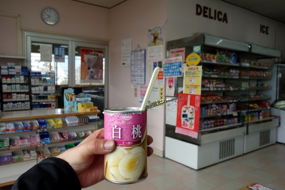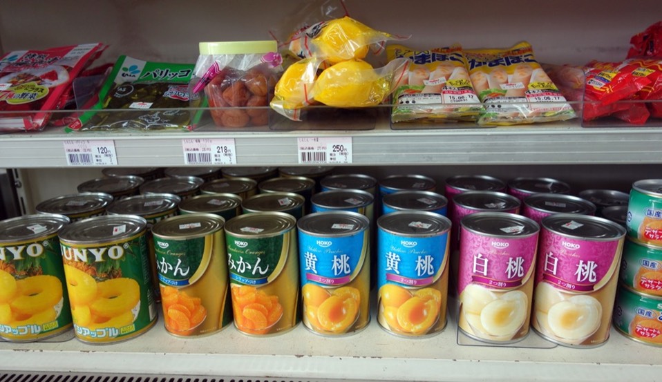 只要在超商上厕所,我都会顺便买个什么东西作为谢恩,在传统商店内看了看,发现水果罐头超级便宜的,居然通通都只要105円。