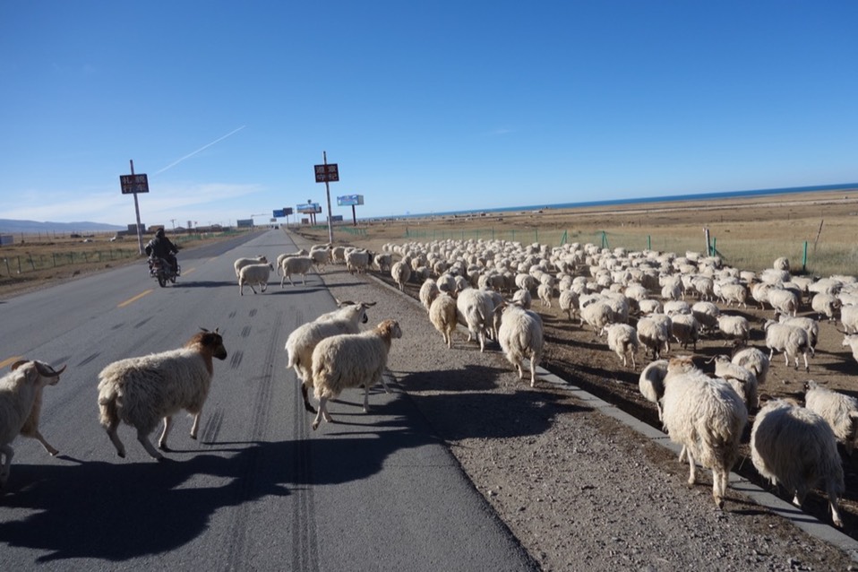 青海湖也许有严格的开发限制,一路上只见牧场(通常会兼作餐厅跟住宿)养一堆的羊和牦牛。