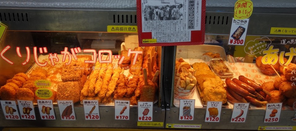 价钱也便宜,很多都只要120円,我买了炸鸡,炸薯条跟炸马铃薯(就是那个中山峠的名产,其实处处都有)。