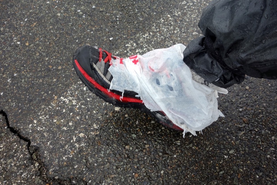 磨破的塑胶袋,总算可以拆下来,换一个新的上去挡着。鞋子湿了,连带两双袜子也湿了,不知道该说运气好还是不好。