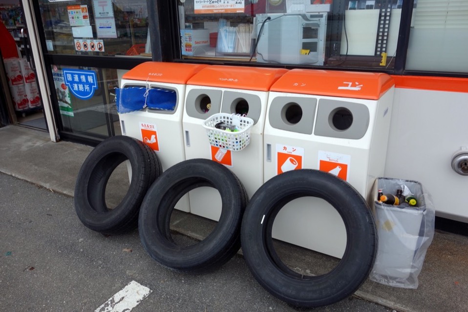 门口的垃圾桶(全北海道的便利商店我只看过Seicomart会在门口放垃圾桶),放了三个轮胎。
