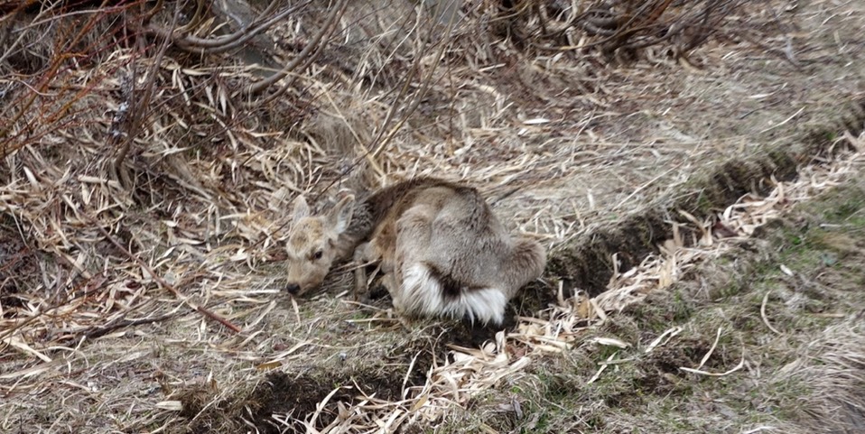 半路上还碰到根本就是保护色装扮的小鹿(?),我觉得他受伤了,所以趴在那边,可是靠近他又还能走跳,希望他没事。