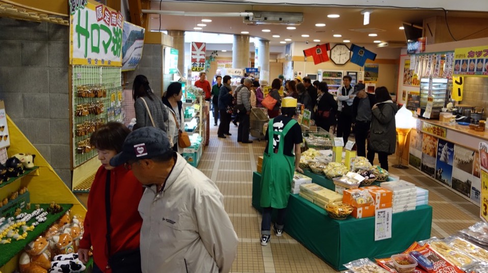 休息站内,原本都没人,结果来了一辆游览车,然后客人就满了,店员都活络起来,开始招待上门的生意。