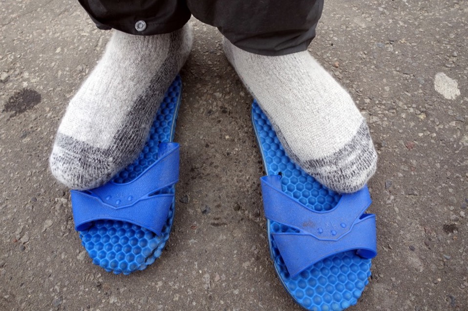 右脚的袜子有一点湿,穿上还是可以挡风防寒,顺便把袜子给弄乾。应该在雨停的当下立刻穿上袜子的,白冻好久。