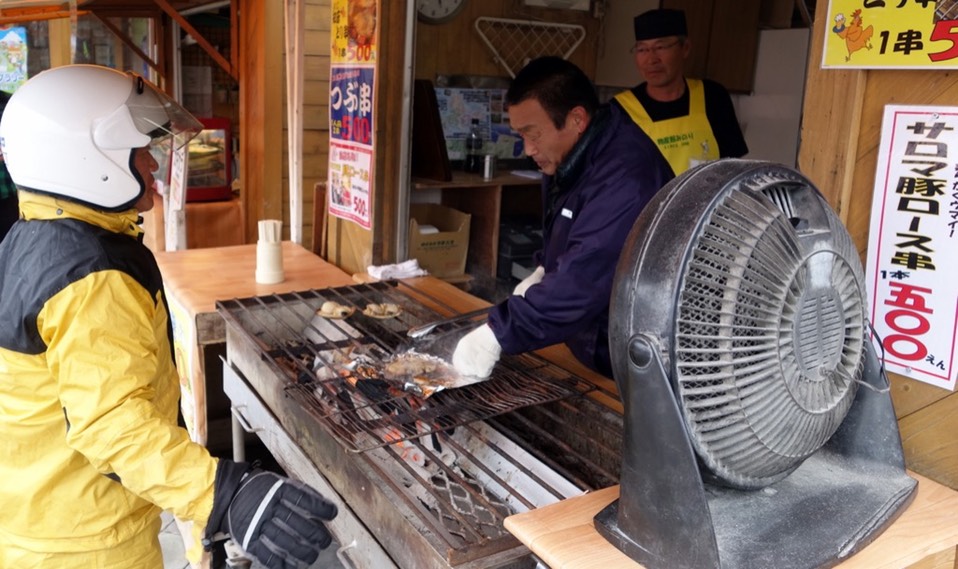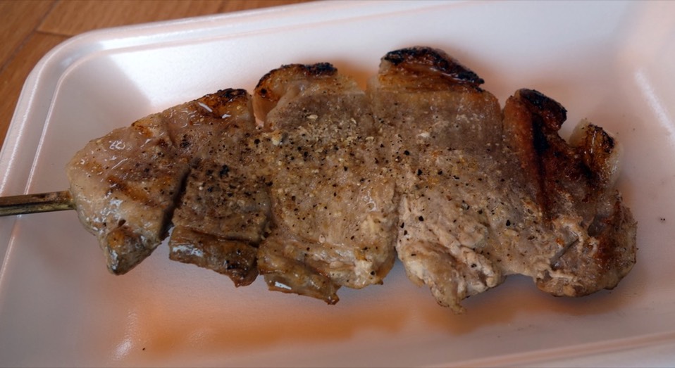 寒冷的外头有一个烤肉摊,只卖两样东西,烤帆立贝跟烤猪肉,我脑袋大概是被冻坏了,那时想说才500円耶~好便宜呀~