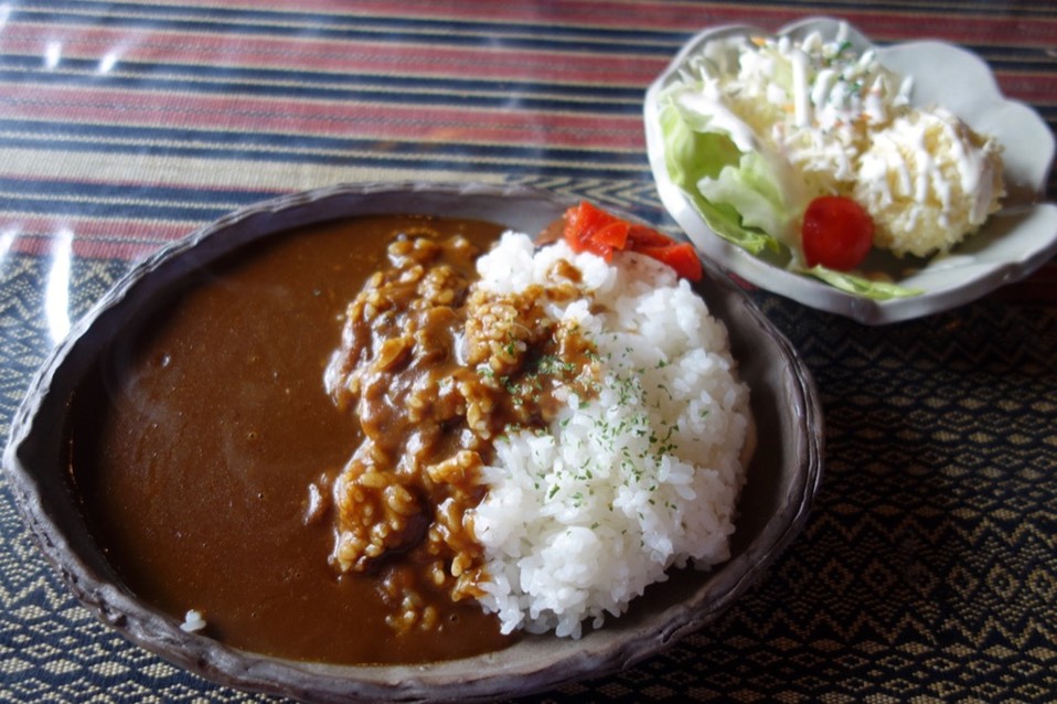 半路上什么都没有的地方出现一栋小木屋,是餐厅,主打咖哩饭,时间12点半,来吃午餐吧。