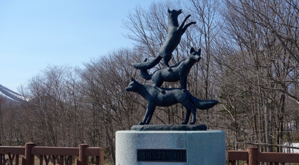这里有一条何,叫钏路川,瞬间钏路这地方感觉没那么远了,桥的四方向有四种动物雕像,这个比较有趣(剩下是鹿跟猫头鹰)