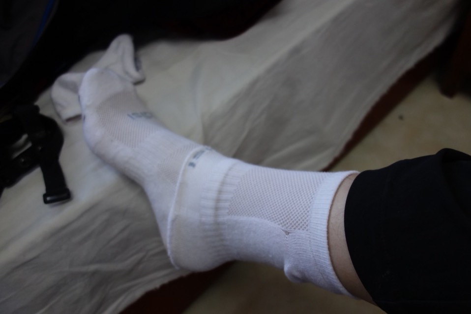 穿上昨天自製的脚踝袜,这次没有穿好,下面的袜子应该要套在脚踝袜上,这样脚踝的部分才不会往上捲动而位置跑掉。