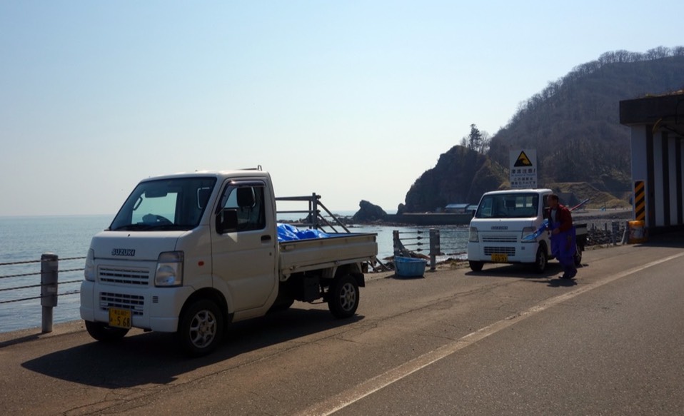 这就是有起重机的小货卡,停在这边,把人垂降下去捞昆布,然后再拉回来。