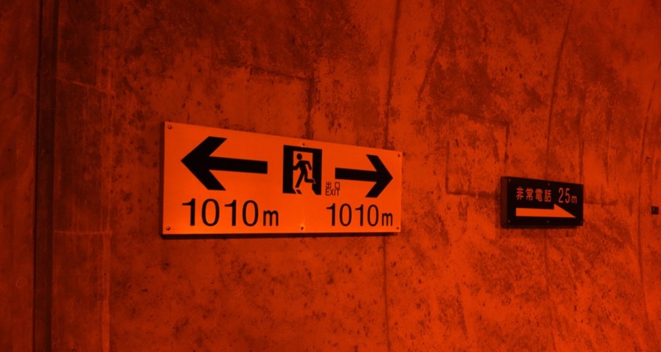 骑在没车的隧道内真稀奇~骑到一半紧急停车。隧道内会有标示距离,离两边的出口分别还有几公尺。