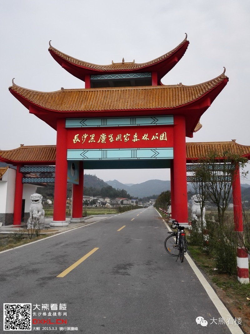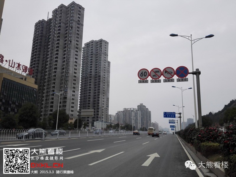15:27到了芙蓉路和黑麋峰的交叉口处,有朋友问黑麋峰怎么走,实际上很好找,这个三岔路口有很大的广告牌,看路标就知道走了~然后,路况就好很多了,车少灰尘少,骑行开始愉快起来~