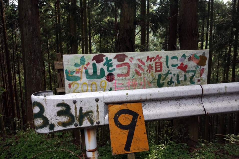 路上的海报,都2009年的板子了,他写的是,「山不是垃圾桶」,一路上有1...2..3的牌子,不知道什么意思,现在是9,等骑到10就爬完了。