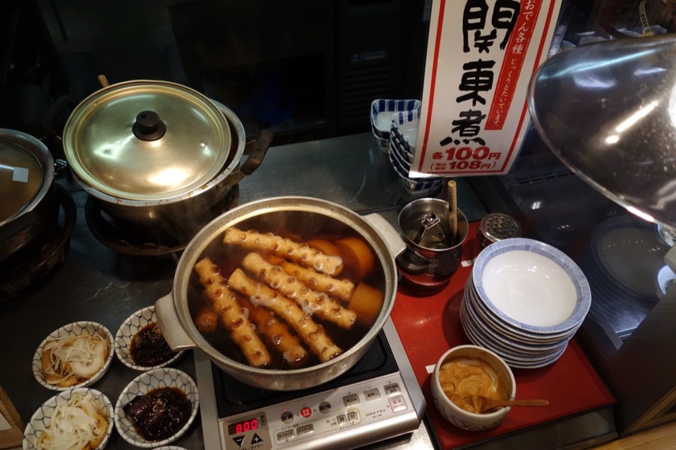 会热的只有饭麵汤跟关东煮,一个才108円挺便宜的,看那竹轮超大的说。