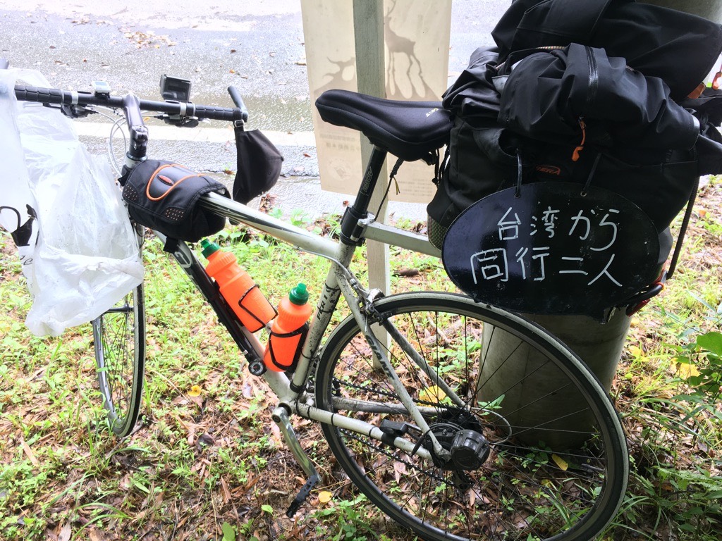 雨停了,把塑胶袋给卸下来,小黑板的标语现在写正确了。雨衣雨裤不穿的时候就用弹力绳固定在包包上。