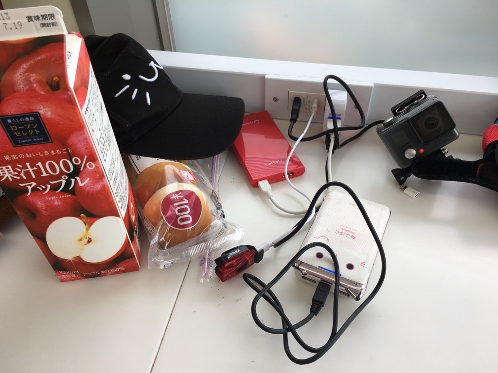 老孙便利商店喝果汁吃麵包、休息兼充电,单靠单车发电还是无法供给所需电力(即使我带的3C设备这么少了)