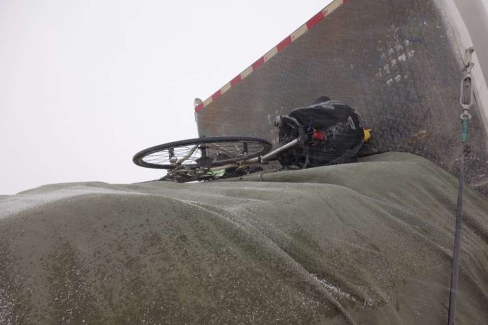 司机爬上载货的车斗,叫我把单车传上去给他。
