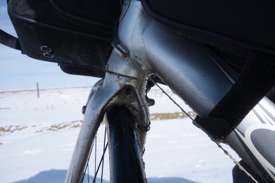 然后这些积雪就会卡在前后叉的位置,接着轮胎就会被冻住,我又得下车凿冰(我的凿冰技术越来越顺手了~)