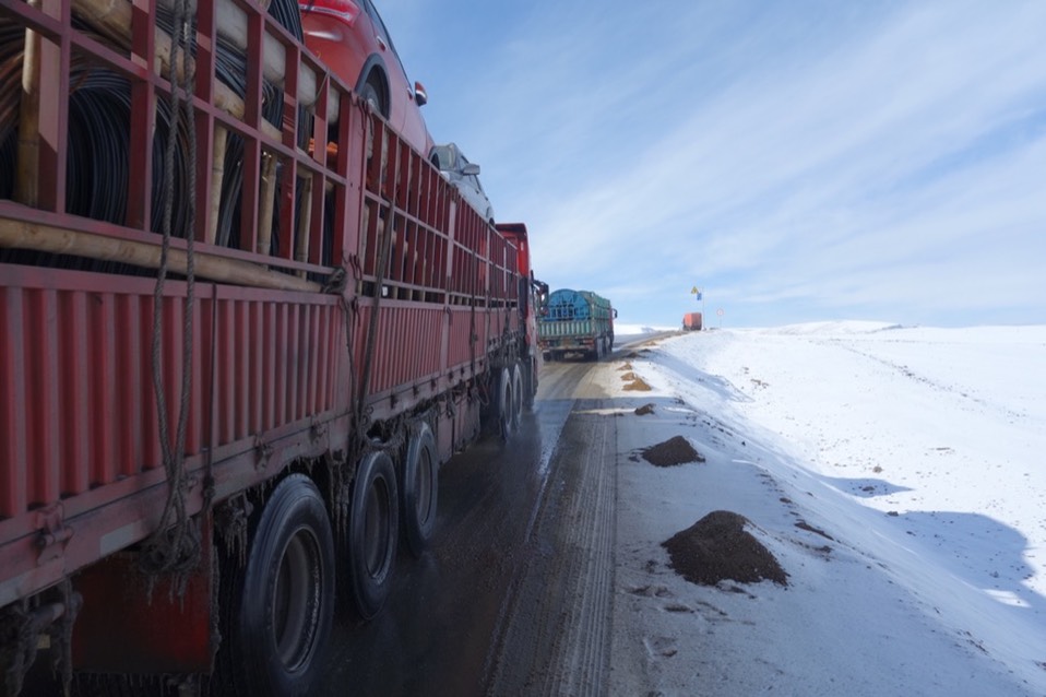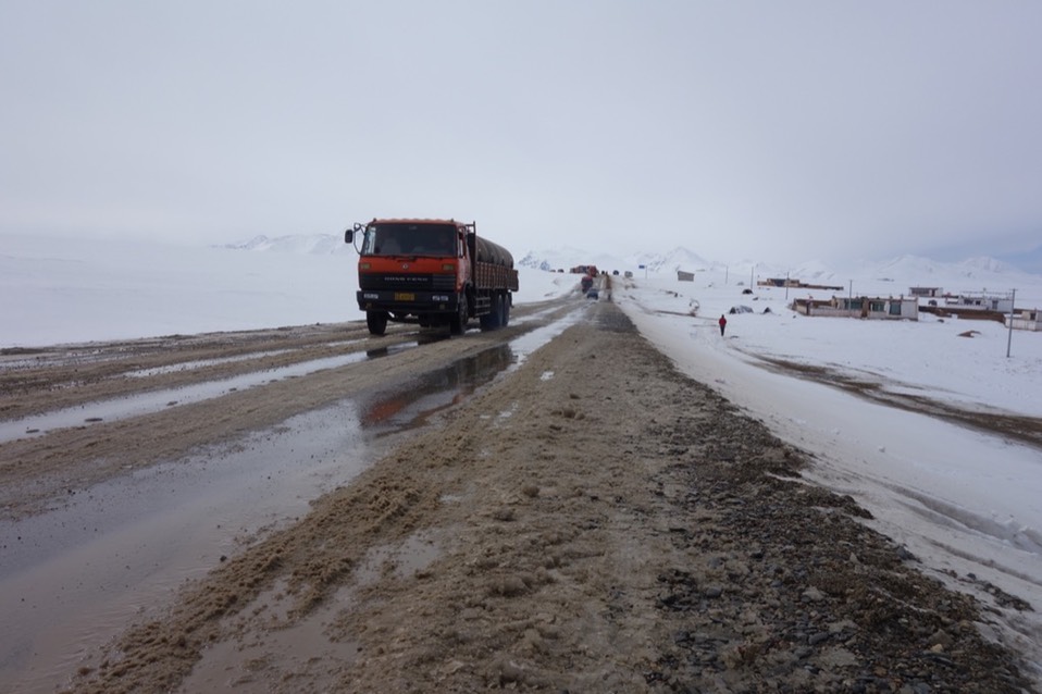 所以只能慢慢的开过我,可是卡车轮胎溅起的碎冰其杀伤力实在太高,我还是会停下车,把小喵号牵到路边,等卡车经过。