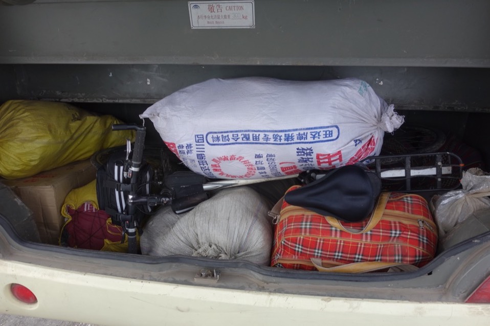 由于后车厢已经放了不少东西,所以得先拿出点什么,把车放进去,再把拿出来的时候叠回车上。
