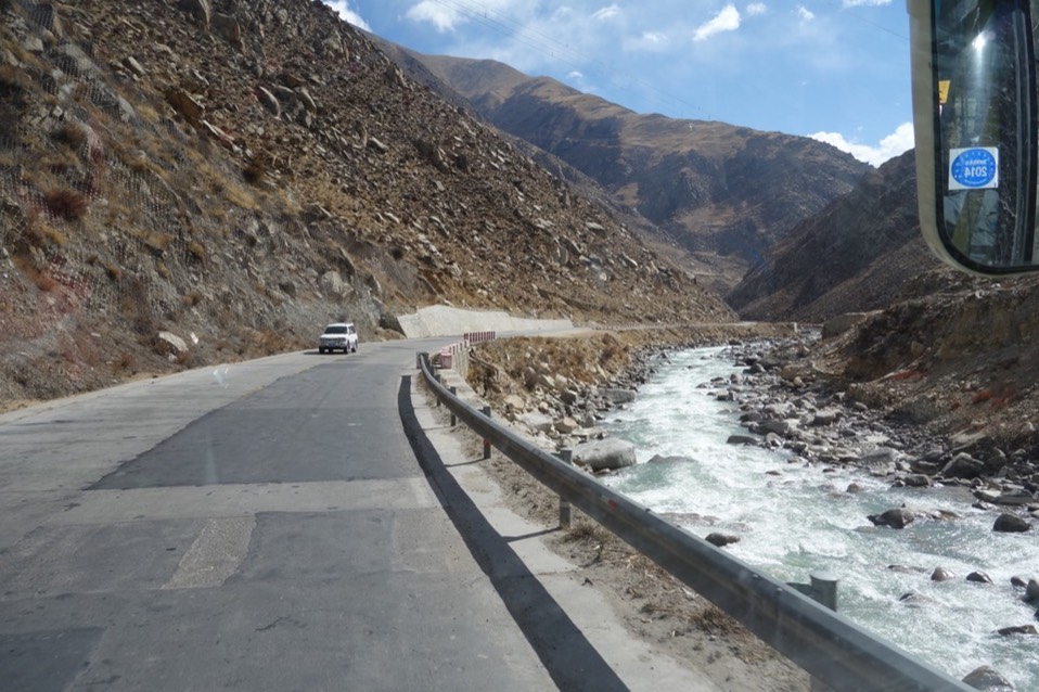 过了羊八井是很蜿蜒的下坡山路,转来转去的,伴随着马路的是一条溪水湍急的河,一路流到拉萨。