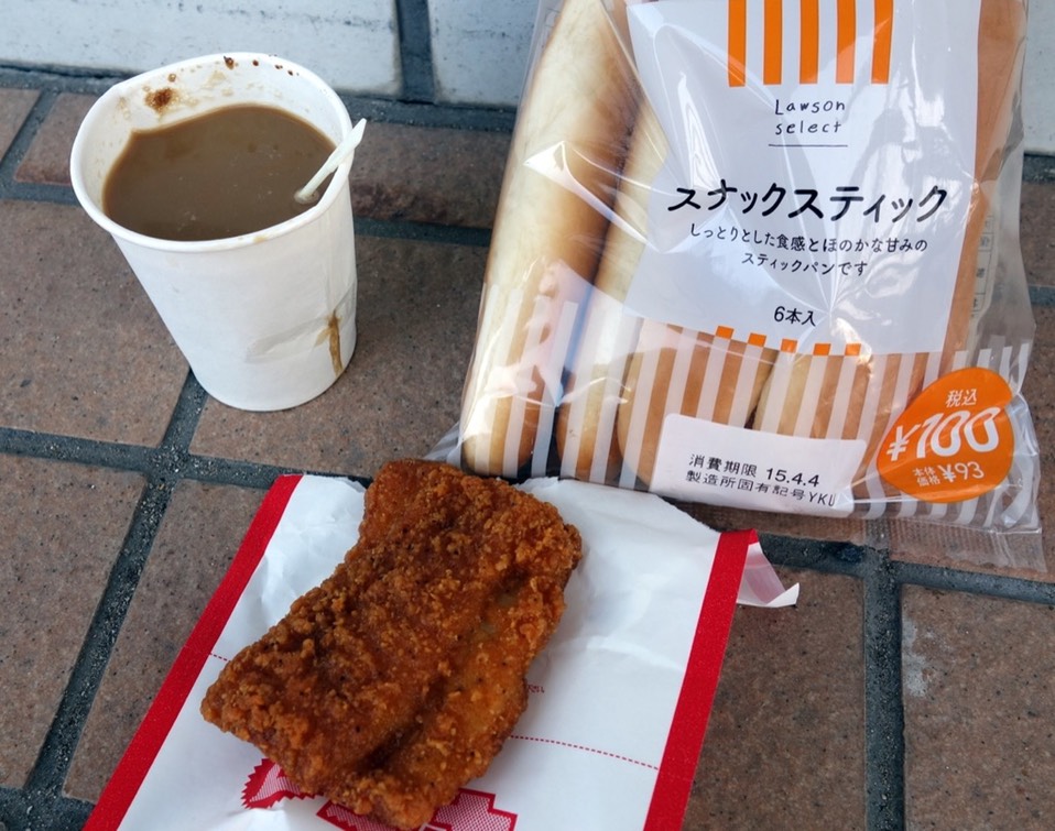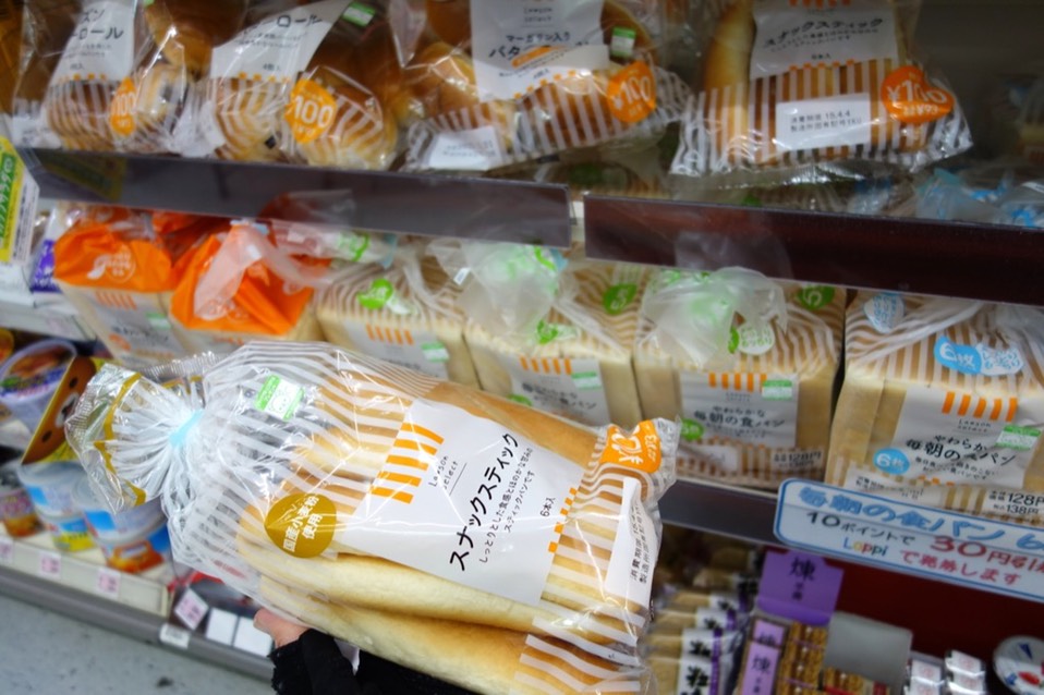 吃了两天土司有点儿腻,小餐包完全吃不饱(土司则是吃不玩需要带着走),发现新的长条状麵包,口感鬆软,价钱超便宜含税才100円。