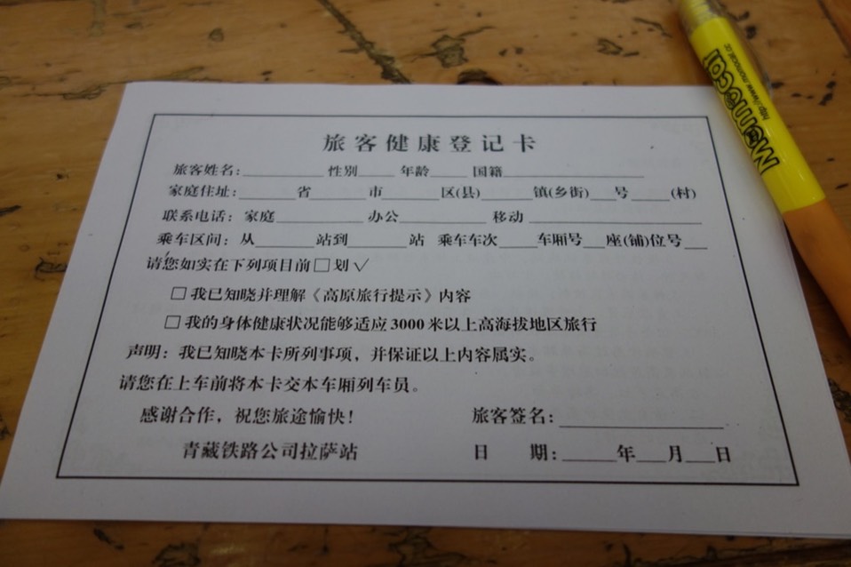 然后搭乘青藏铁路都会被要求要写的健康登记卡。