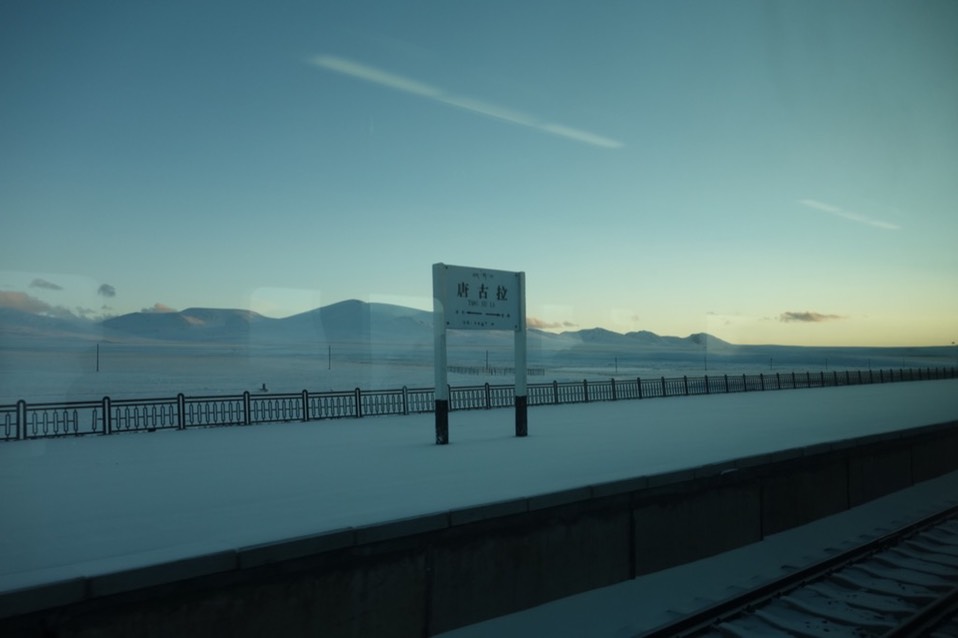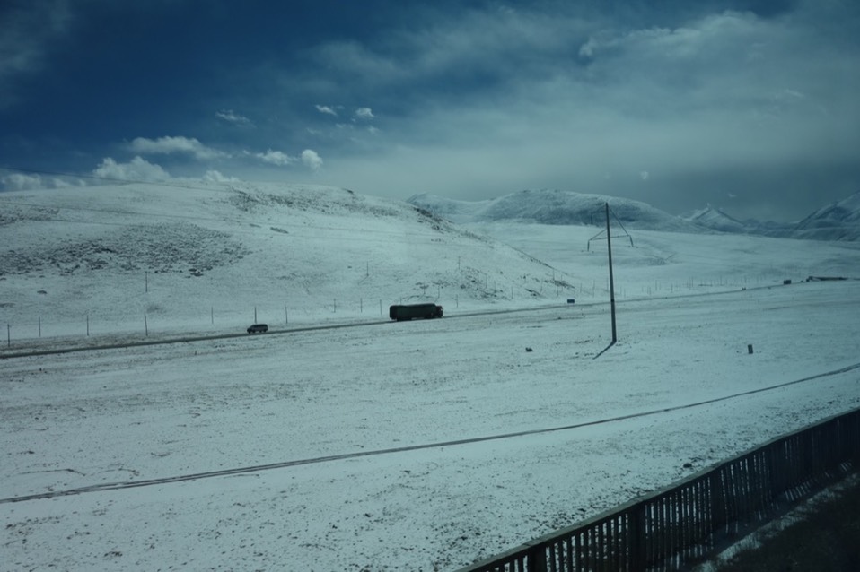 火车开得算快,没多久就爬到了白雪茫茫的高原上,旁边就是青藏公路。