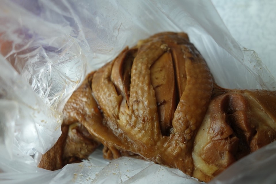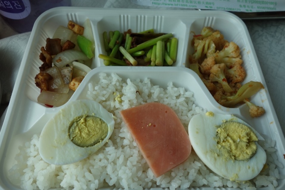 我拍完照,听到价钱之后,就还给了车厢内兜售便当的餐车,改买一只25元(台币约125元)的滷鸡腿。