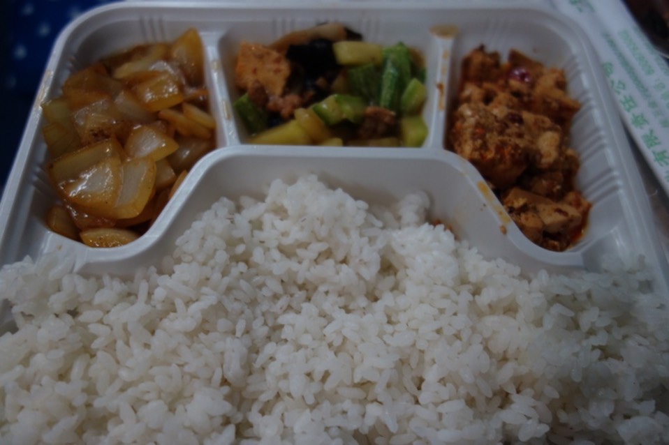 入夜后,餐车又重新登场了,继续吆喝着超贵又难吃的便当。中午只吃了一只滷鸡腿,真的饿了。只好买一个。