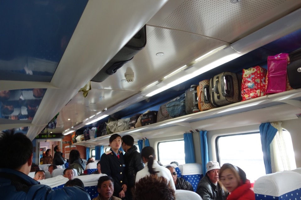 硬座非常客满,拿着纸箱的我很不方便移动,车厢内也放不下纸箱,只能倚靠着车厢门的走道口摆着。