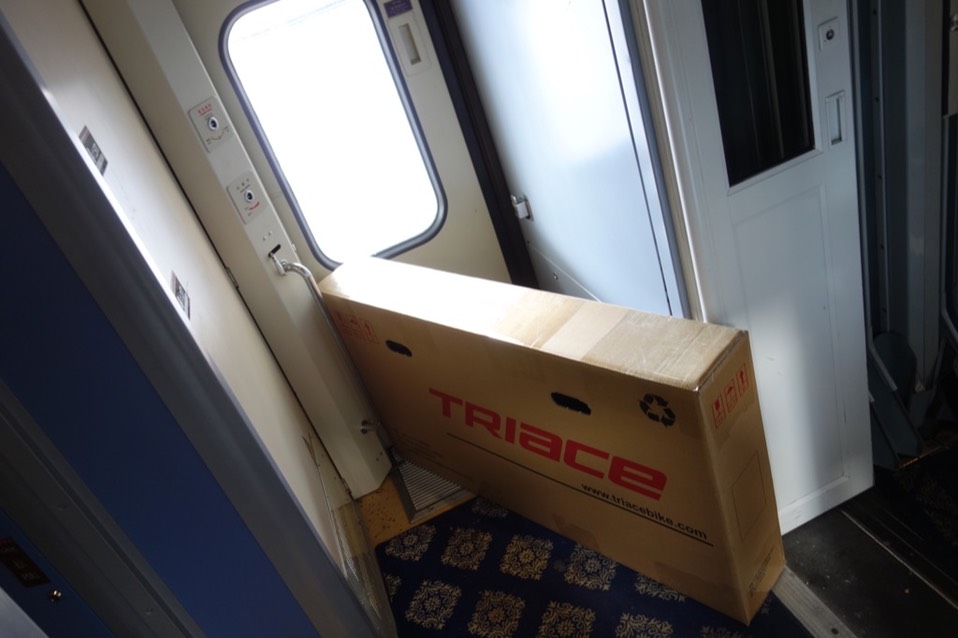等我把纸箱放好,车内的行李架老早已被塞爆,诺大的包包只能放在脚边,很卡,毕竟位置已经很窄。