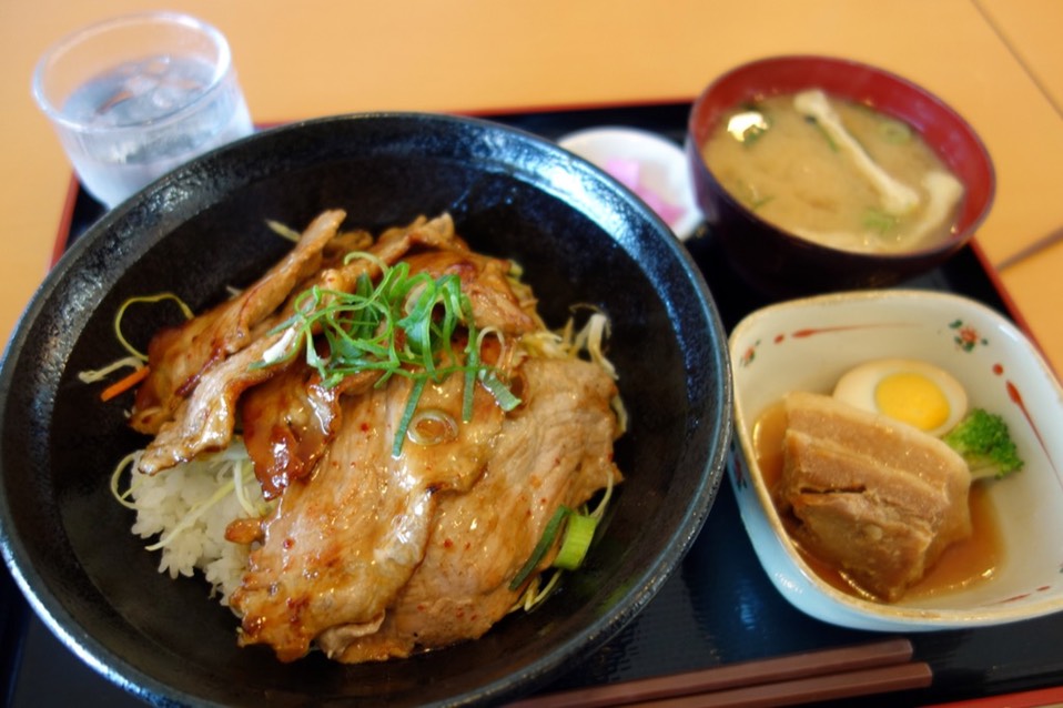 吃这个~豚丼加饭,还拿了一个滷猪肉配半颗滷蛋的小菜。