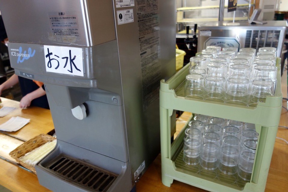 水很酷,会有小冰块一起跑出来。旁边还有热茶、咖啡机,也是用餐的客人就可以自取。