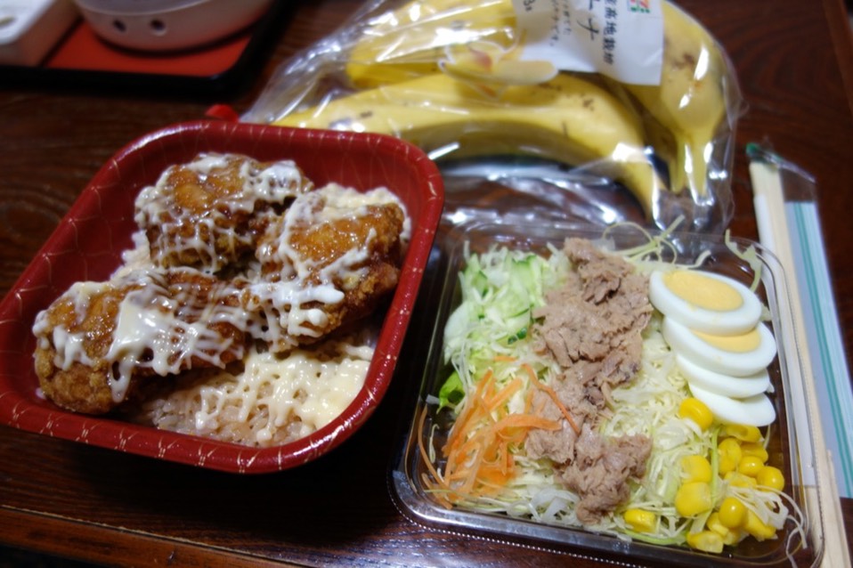 再去隔壁超商买一个小沙拉当配菜,另外再来三根便宜又好吃的大香蕉,刷卡~愉悦~(千万别把卡片给弄丢了_(:3 」∠ )_