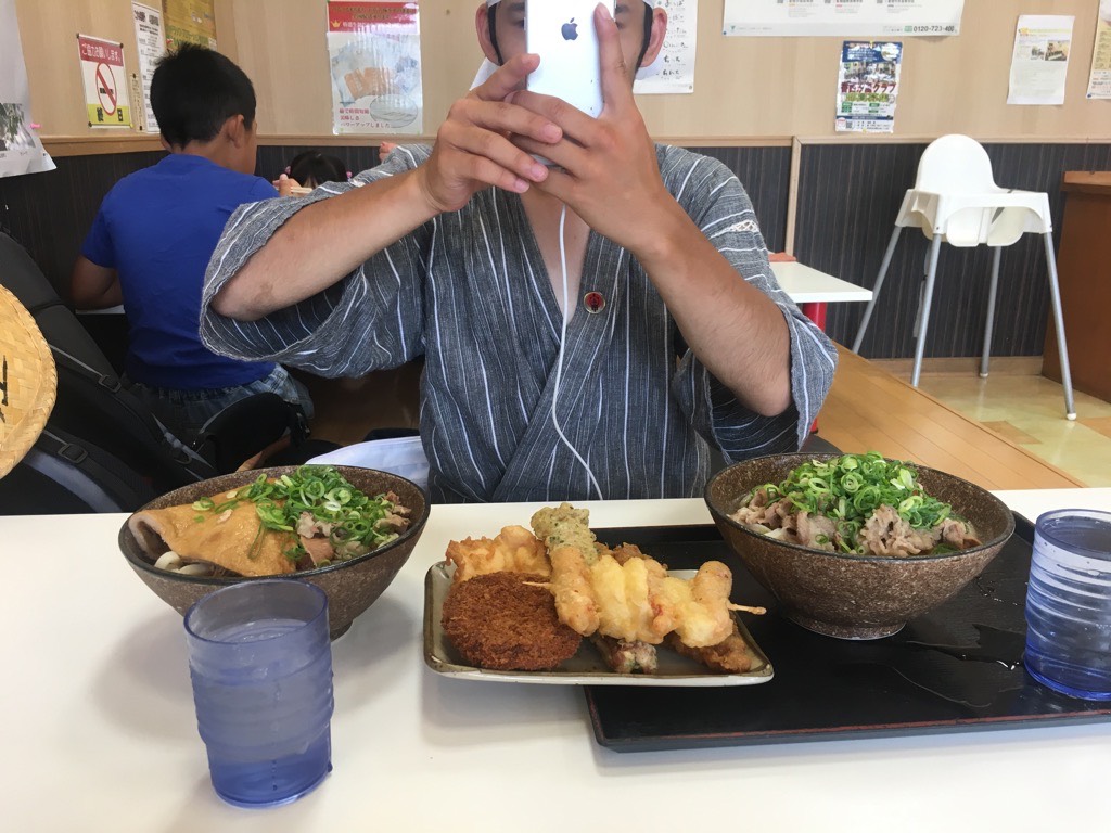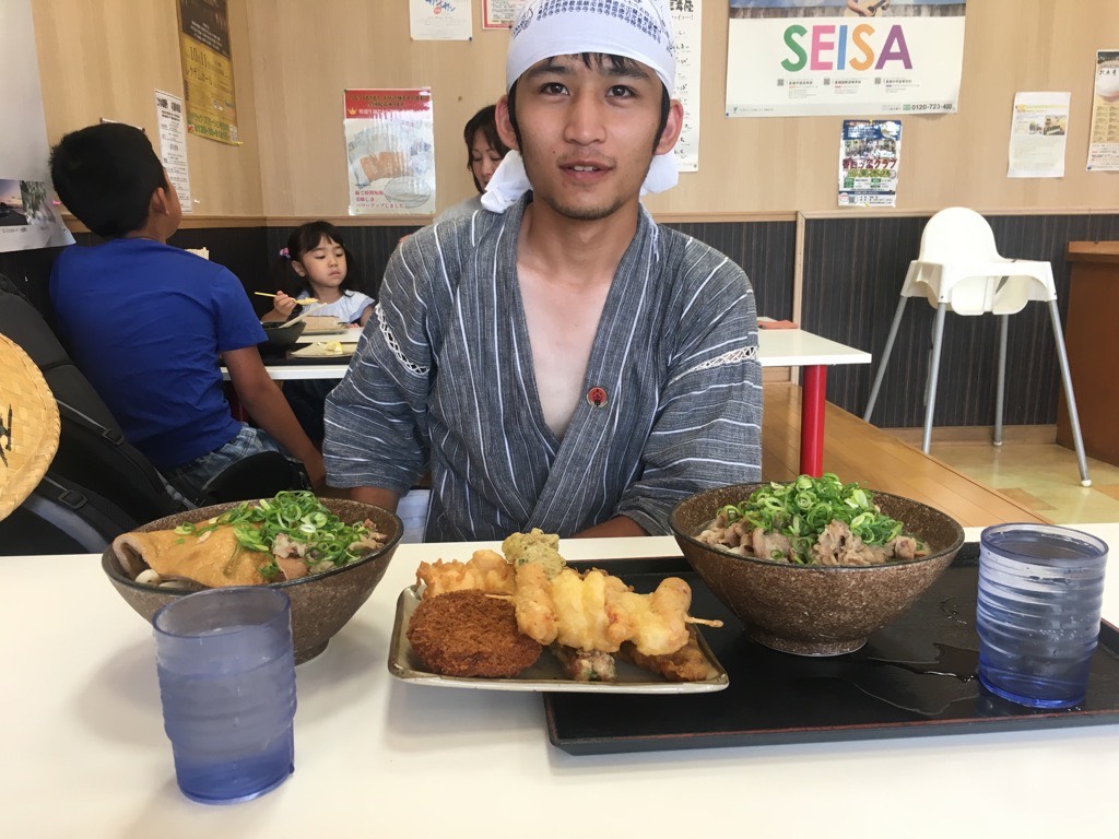隔天上午等他拜完82番,走下山之后,我们在「鬼无」这个地方的乌龙麵店一起吃了十点半的早午餐。