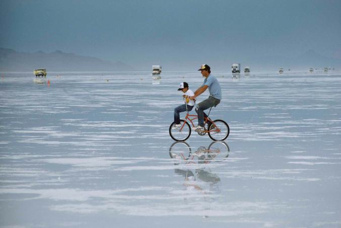 1985年美国犹他州博纳维尔盐滩上骑行的人,远处是汽车拉力赛,这个盐滩很容易让汽车陷在里面,但骑自行车没事。