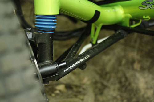 车子轴距加长,无论在平整的路面或是崎岖的山路,加成轴距可以提供跟高的稳定性,大大减少因为三轮带来的重心侧倾问题。Scorpion fs 26最令人兴奋的应该算是它的连杆避震结构,独立悬架臂避震结构,是每一个工科男无法自拔的最爱。不过独立悬架的并没有采用品牌避震器,应该只是HP Velotechnik自家产的弹簧避震,这个有点掉价。